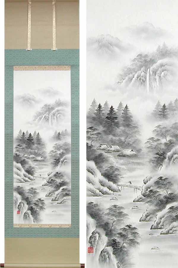 掛け軸 水墨山水 (和田泰明) (掛軸小物なし) 送料無料【smtb-u】(掛軸) 価格: 37,275円 遠方には山並みがそびえ、山里には人々が静かに人々が静かに毎日の暮らしを営んでいます。繊細な筆づかいで描かれた、心落ち着く奥行きのある山水画です。見るほどにホノボノとした味わい深い一幅です。※この商品の付属サービスは、桐箱のみとなっております。風鎮・矢筈は付属いたしませんのでご注意ください。【床の間サイズ01】【用途:年中掛】※各アイコンの意味は、こちら画 題水墨山水(すいぼくさんすい)寸 法丈189cm×幅59cm(尺五立)作 家和田泰明(わだ・たいめい)◆この作家の作品一覧はこちら◆略 歴風会所属、風景画を得意とする。体 裁表装:三段表装軸先:木製本紙:絹本↑掛け軸を大切に保管する専用桐箱に (更新日時:2010/12/15 07:39) Supported by 楽天ウェブサービス |